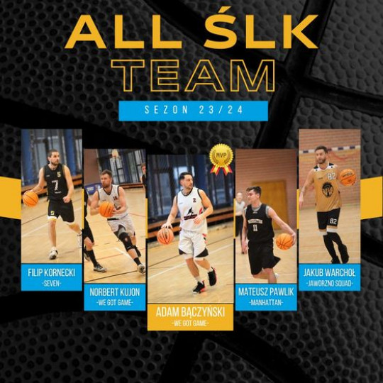 Adam Bączyński (We Got Game) - Ciężko jest znaleźć statystyki, w których Adam nie jest na pierwszym miejscu lub przynajmniej w czołówce. Najwięcej punktów, asyst i przechwytów na mecz w całym sezonie! Lider ekipy WGG, z którą przez cały sezon do meczu finałowego nie zaznali smaku porażki. Wicemistrz i MVP seoznu 2023/24 ŚLK.